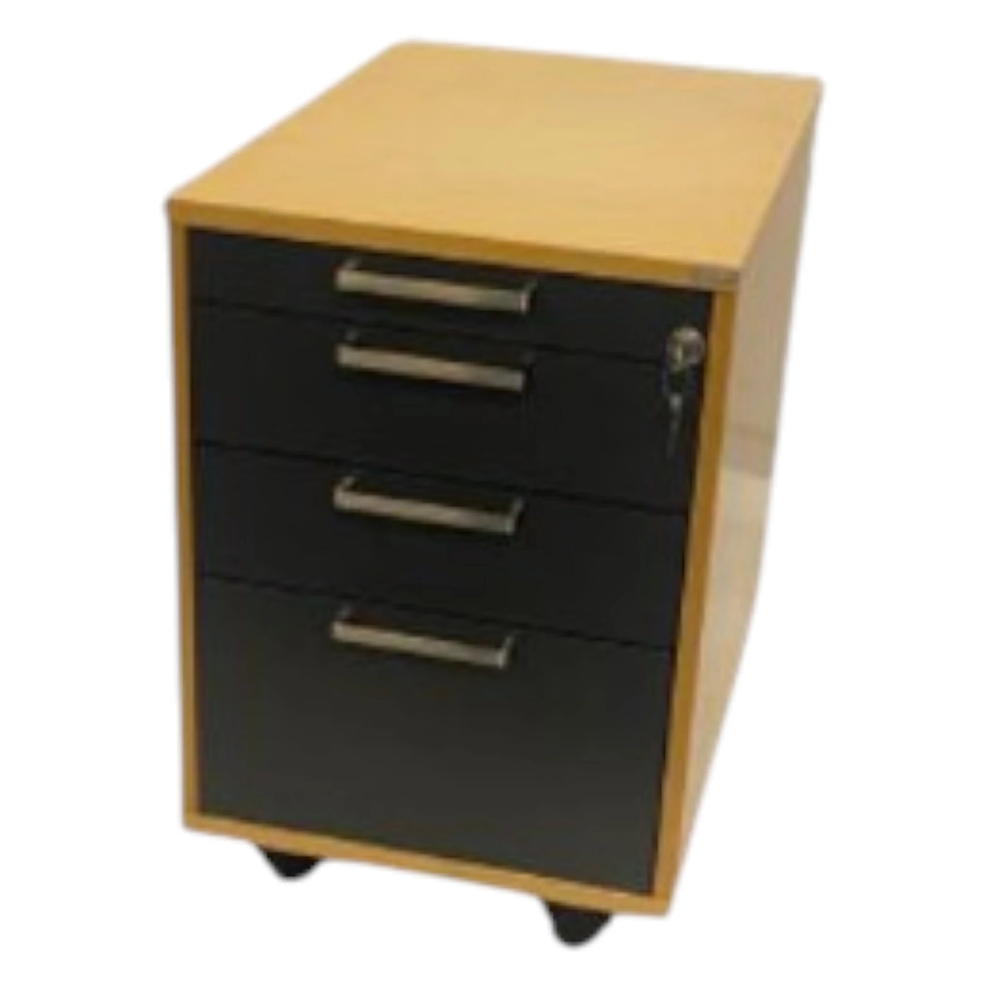 Brugt skuffedarium i træfiner med grålakeret front. 4-rums skuffedarium, øverste skuffe kan låses. Greb i rustfrit stål. Skuffedariet er monteret på hjul.