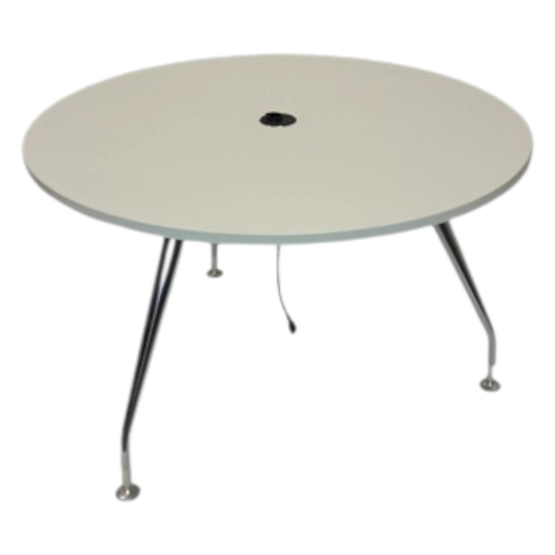 Hvid laminat. Ø120cm. Powergrommet 3-benet krom stel. Max: 5-6 seating.